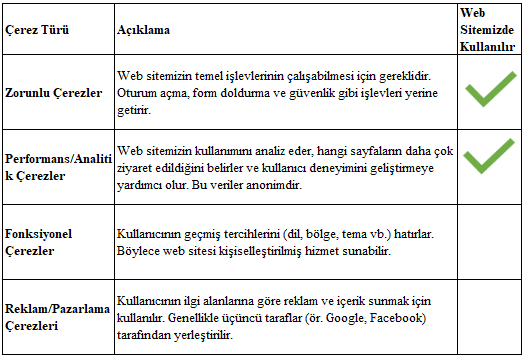 Çerez türleri aşağıda açıklanmış ve sitemizde kullanılanlar belirtilmiştir.